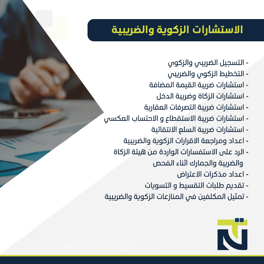 التسجيل الضريبي والزكوي، إعداد ومراجعة الإقرارات، الرد على استفسارات هيئة الزكاة والضريبة والجمارك أثناء الفحص، تقديم التسويات وإعداد مذكرات الاعتراض.